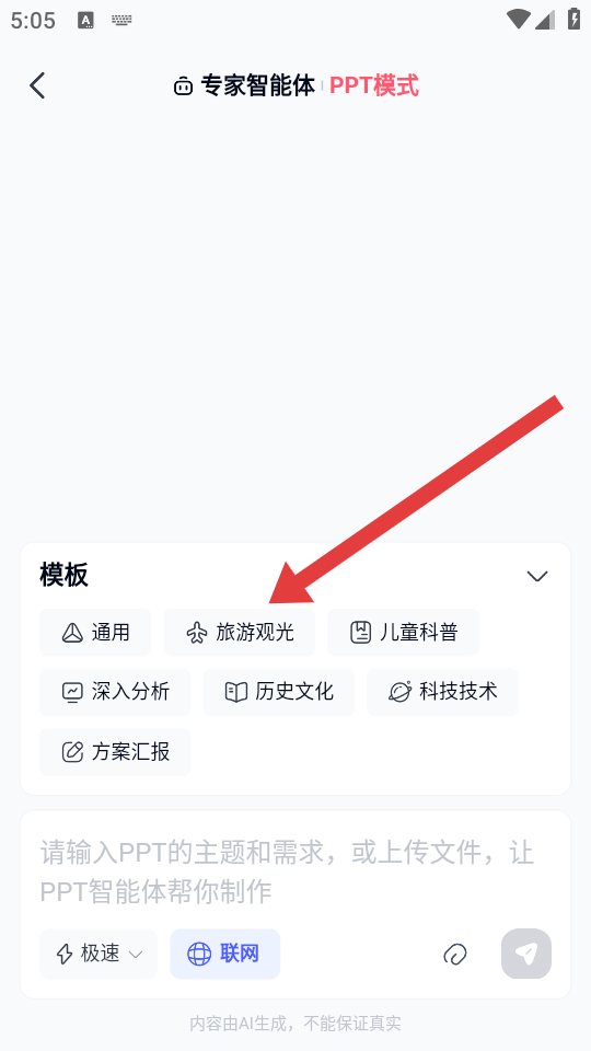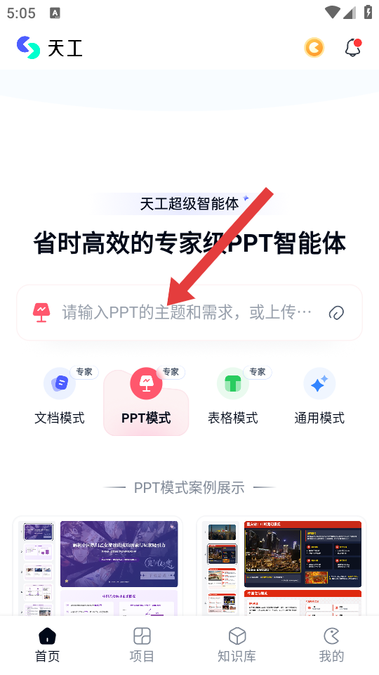 1、进入天工首页PPT模式,可以在输入框中输入PPT的主题和需求。