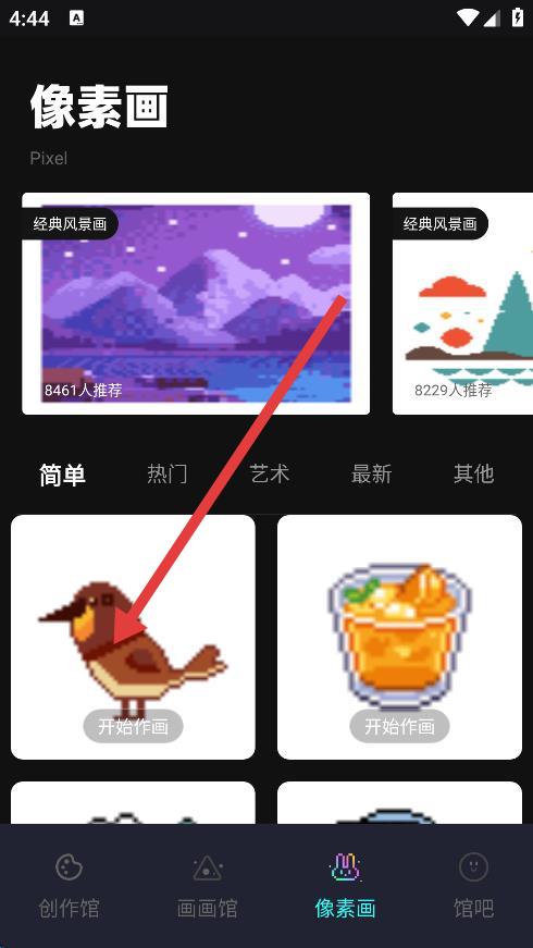 2、挑选想要绘制的图案,点击开始作画,完成像素画的绘制。