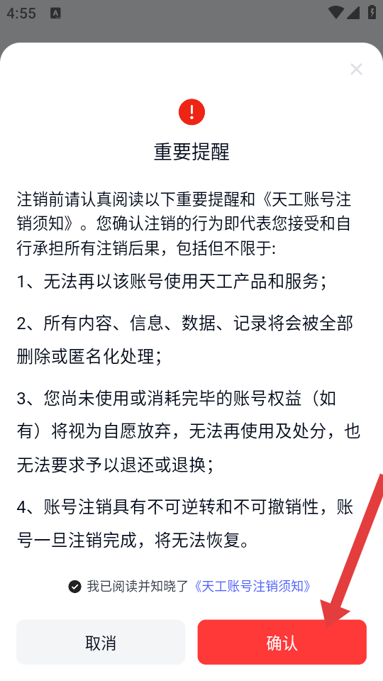 3、在重要提醒界面,勾选已知晓后点击确认,继续注销的流程。
