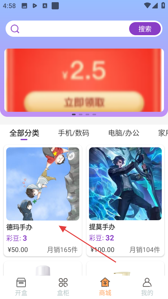2、在商城页面,选择想要购买的商品,如德玛手办,进入商品详情页。