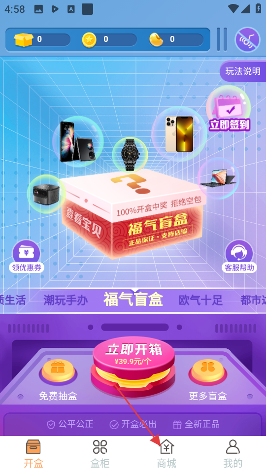1、在开盒页面,点击底部的商城按钮,进入商城页面。