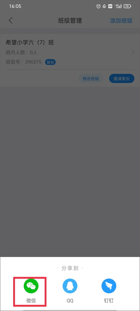 4、页面下方弹出了三个分享方式微信、QQ、钉钉,选择其中一个之后将链接发出去,家长点进这个链接之后就可以进入到班级里查看自身孩子的学习情况了。