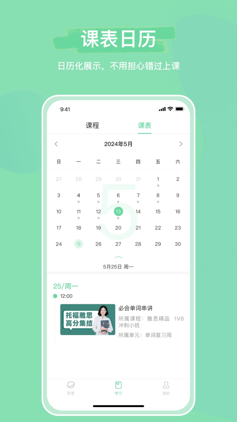 1.自动同步课程安排至日历视图,红色角标提醒上课时间,再也不会错过直播或复习节点。