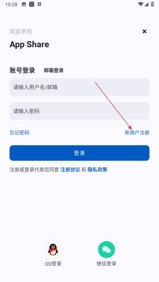 3、在登录界面,点击新用户注册选项,进入账号注册页面。
