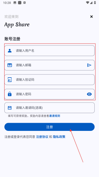 4、在账号注册页面,依次输入用户名、邮箱、验证码、密码,若有邀请码也可填写,最后点击注册按钮即可。