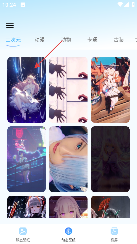 2、在动态壁纸页面,选择二次元分类,并点击喜欢的壁纸,进入壁纸详情页。