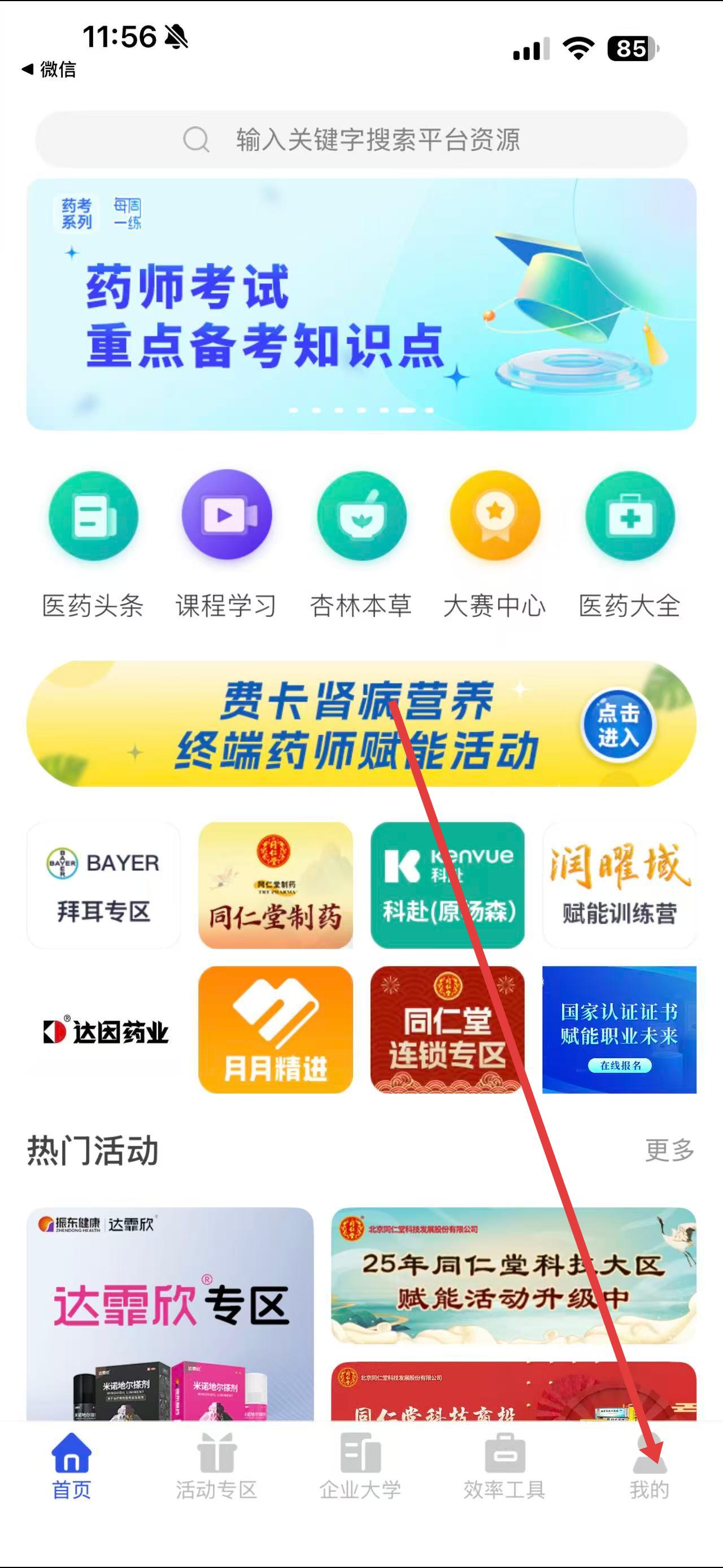 1、打开杏林学堂应用,在首页点击底部导航栏中的我的,进入个人页面。