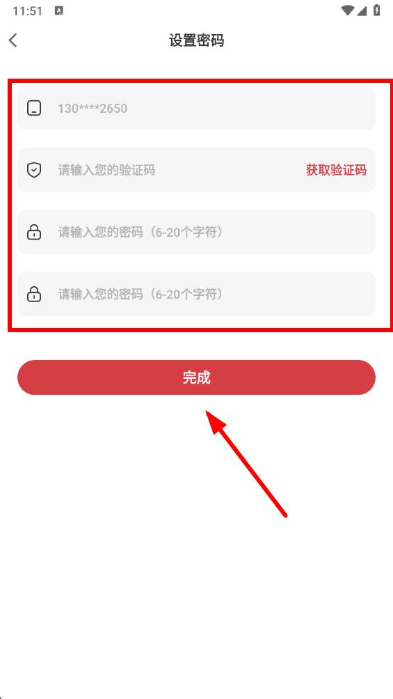 4、在设置密码界面,输入手机号、获取验证码,设置确认密码后,点击完成,即可成功设置密码。