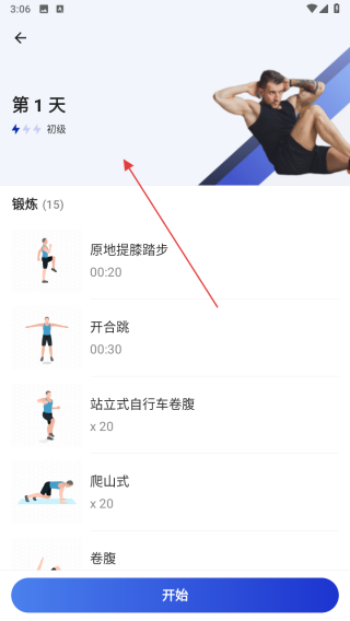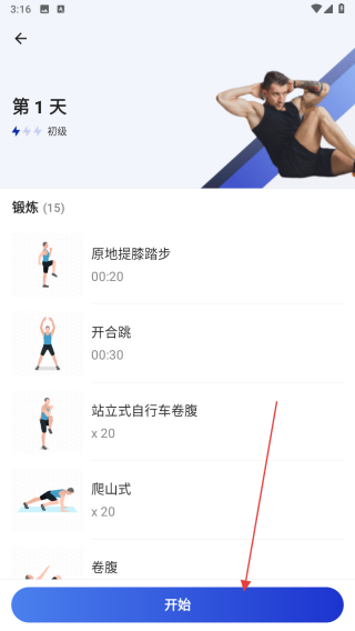 3、确认训练内容后,点击开始,跟随APP动作演示与节奏,完成当日训练,坚持按计划逐天进行,把控动作标准,积累训练成果,迈向目标。