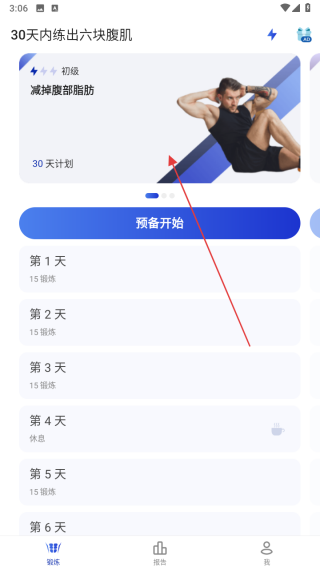 1、进入30天内练出六块腹肌界面,依据自身运动基础,选择初级或中级难度,初级聚焦腹部脂肪消减,中级强化腹肌硬度,选定后查看30天训练规划。