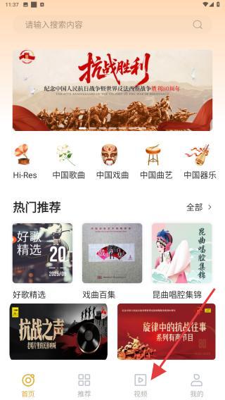 1、打开中国音乐APP,在首页内点击下方导航栏中视频的图标。