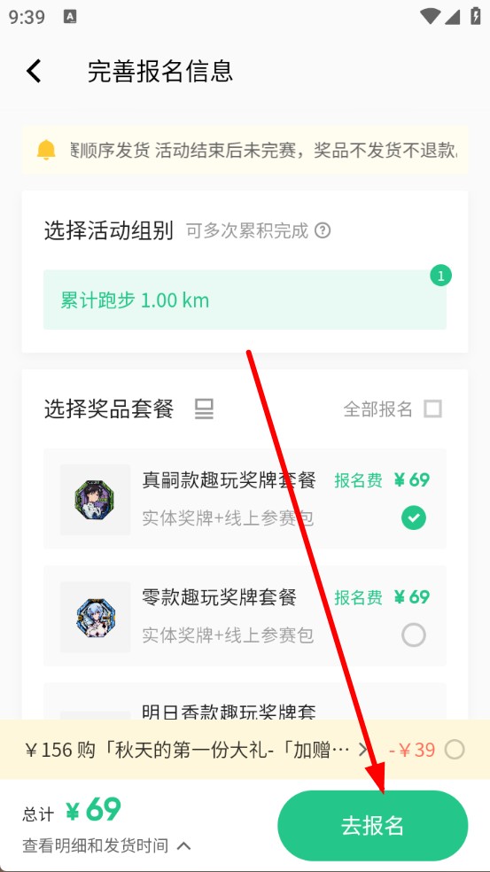 3、在完善报名信息页面,选好活动组别、奖品套餐,确认后点击「去报名」完成缴费,按赛事要求完成运动任务,即可获得对应奖牌。