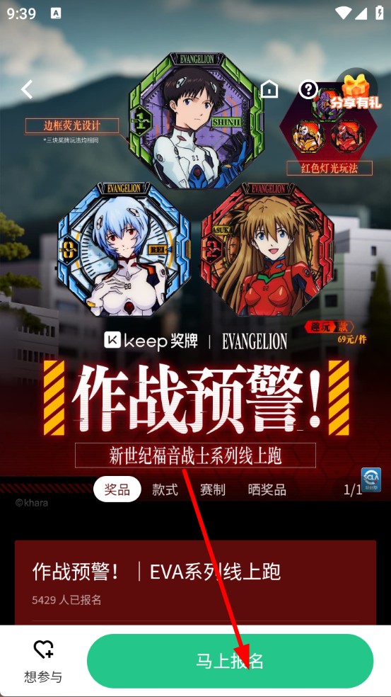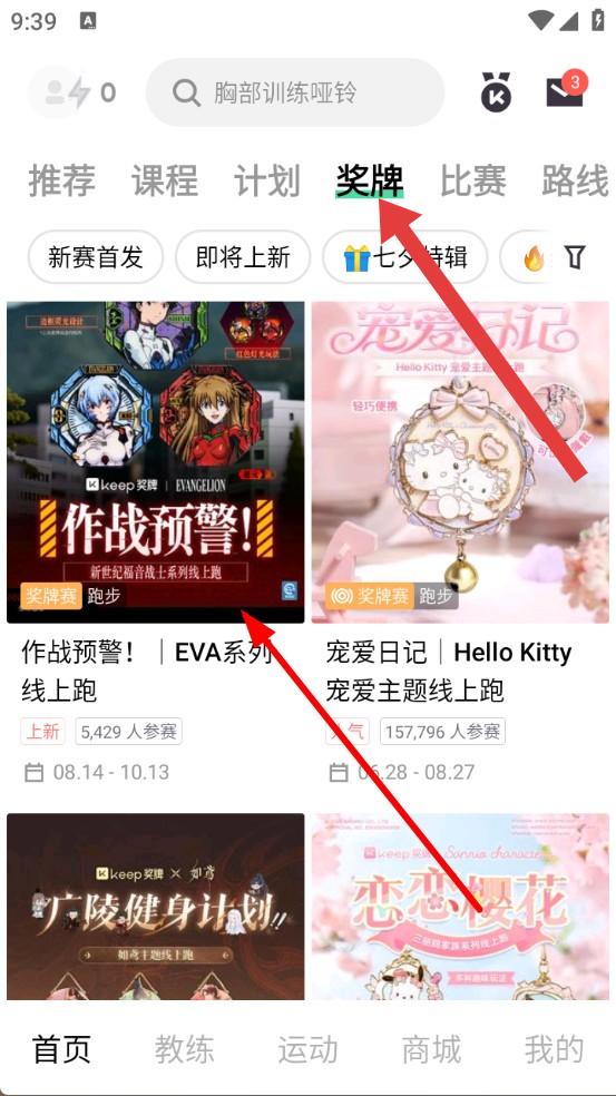 1、打开KeepAPP,点击首页上方导航栏的「奖牌」,进入奖牌赛事页面,选择感兴趣的奖牌赛。