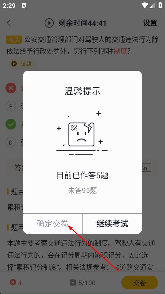 4、在弹出的温馨提示窗口中,确认交卷,点击确定交卷。