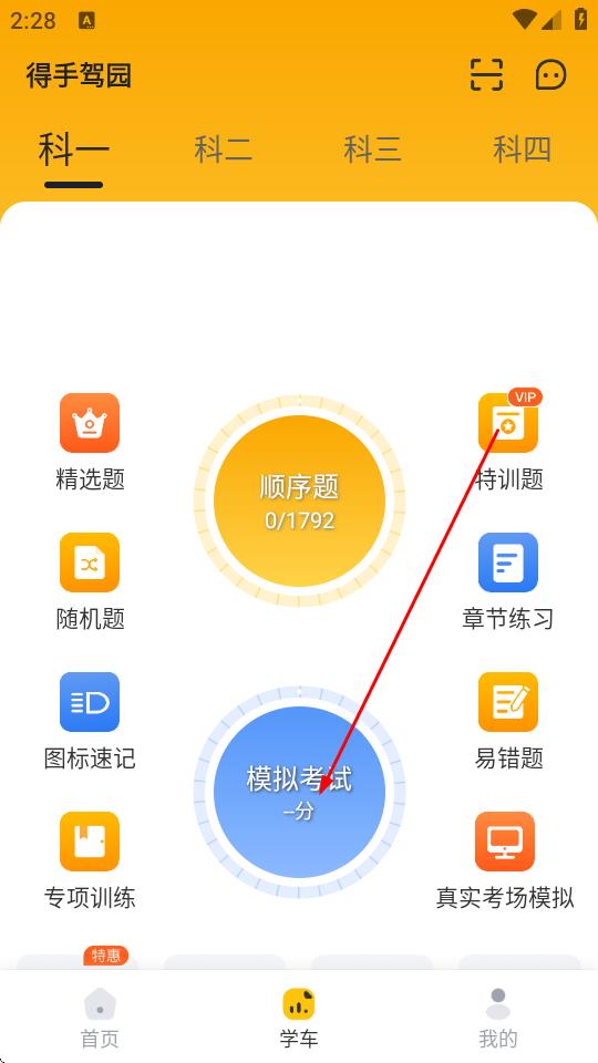 1、打开得手驾园APP,在首页点击模拟考试选项,进入模拟考试界面。