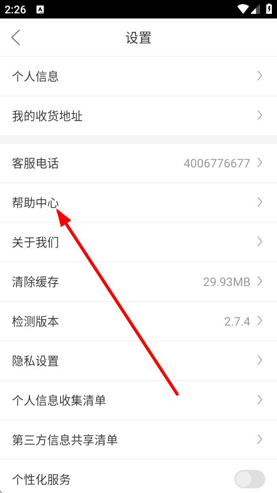 3、在设置界面,点击帮助中心选项,进入帮助中心页面。