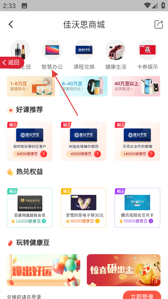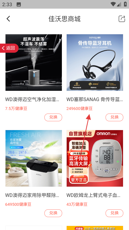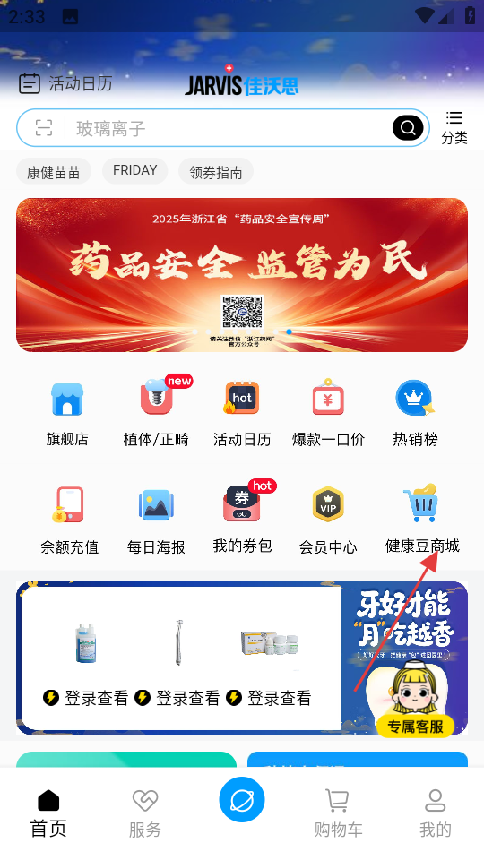 1、在佳沃思首页,点击健康豆商城,进入佳沃思商城页面。