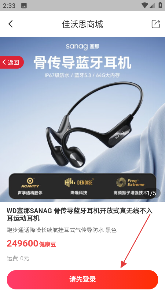 4、在商品详情页,点击请先登录按钮,进行登录操作后,即可使用健康豆兑换该商品。