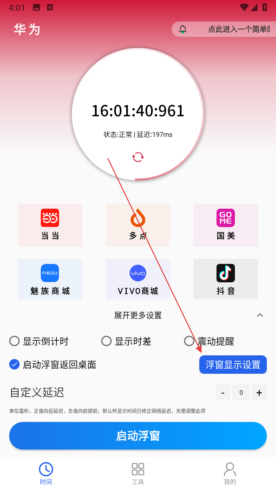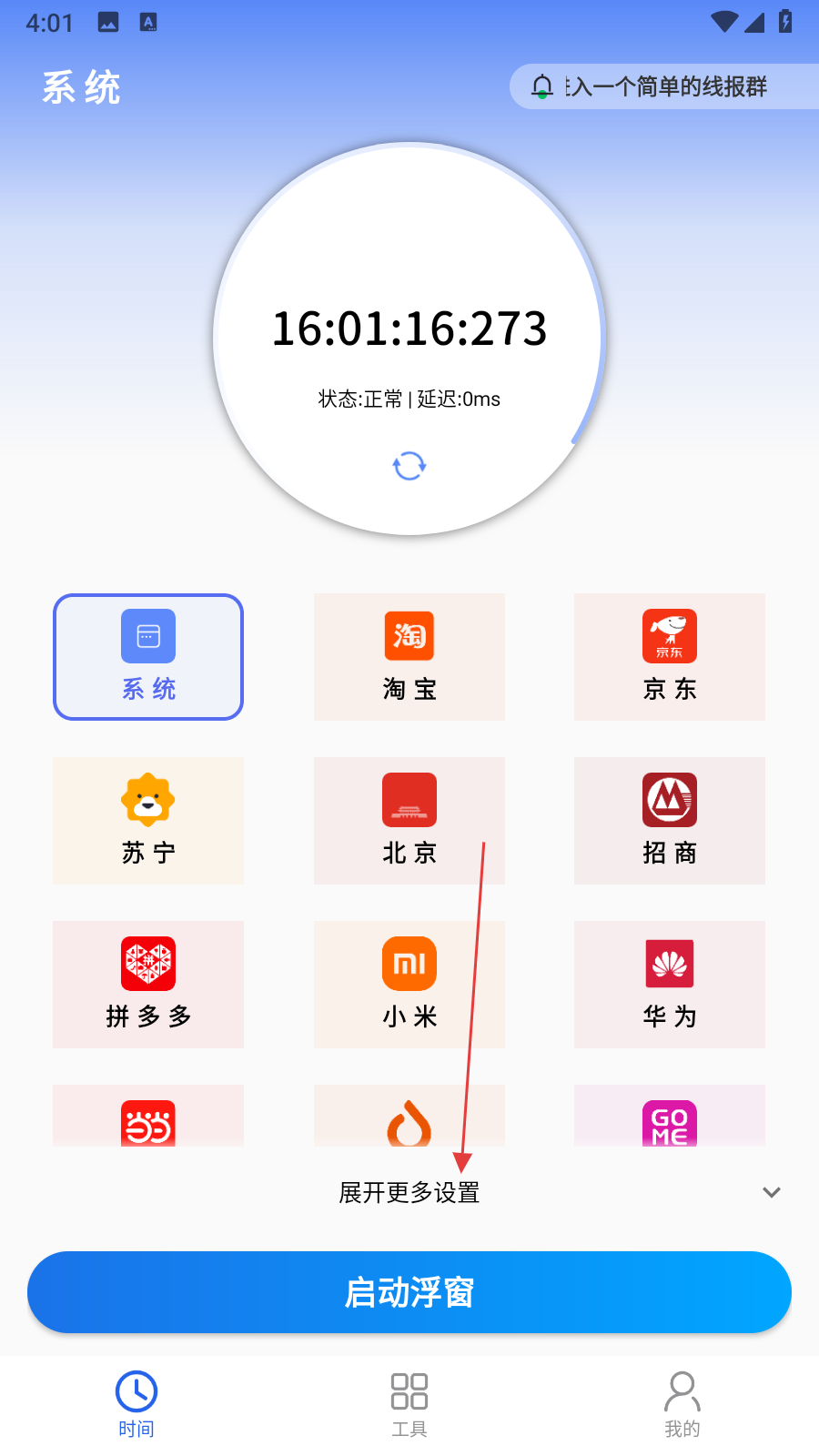 1、打开浮动时间相关应用,进入主界面后,点击展开更多设置。