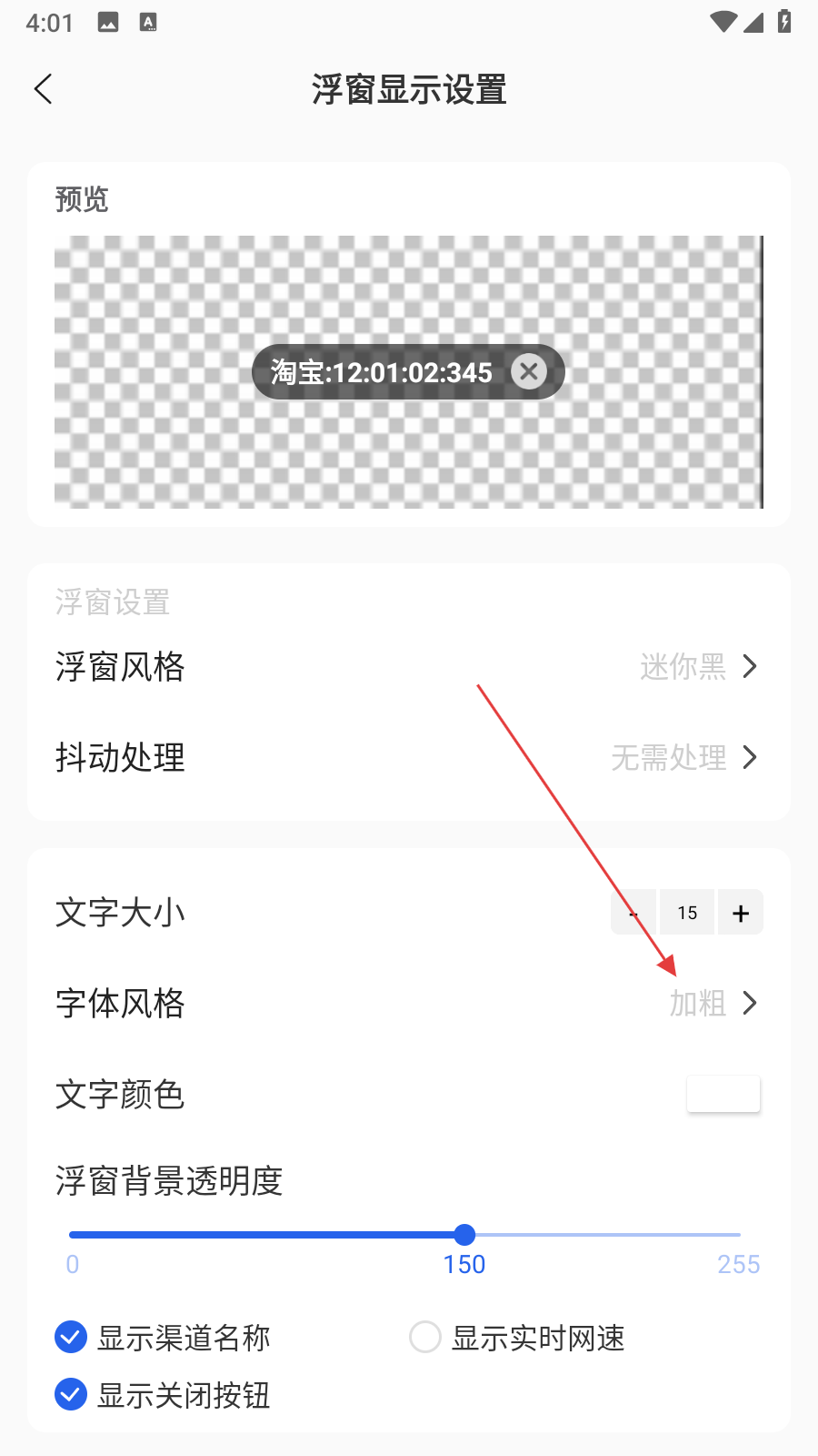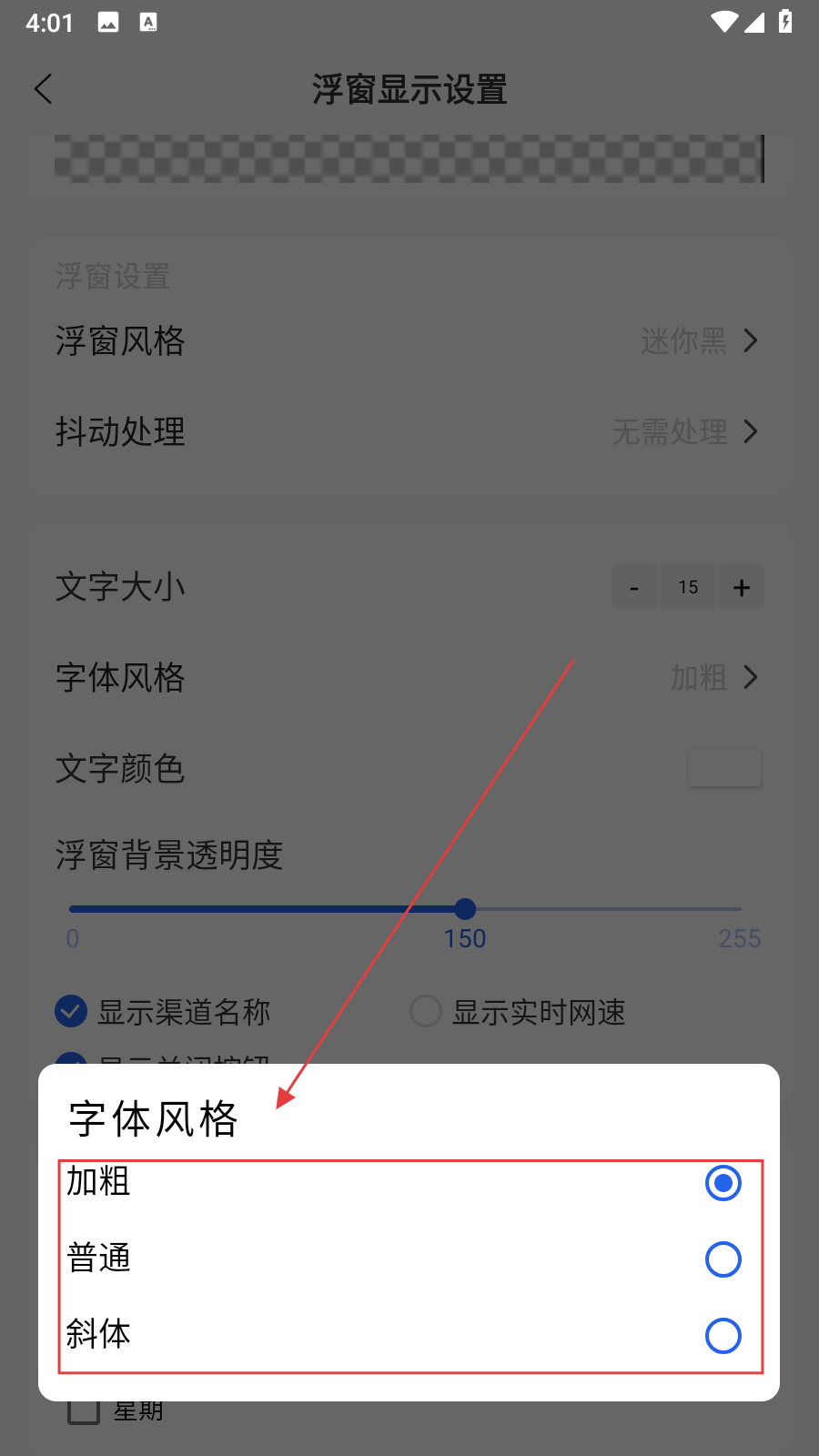 3、在浮窗显示设置界面,点击字体风格选项,弹出字体风格选择窗口。