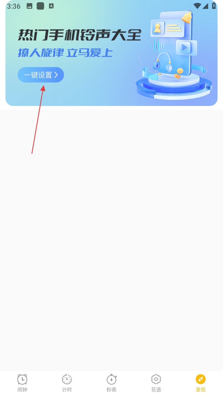 2、在发现页面中,找到展示热门手机铃声大全的区域,点击该区域内的一键设置按钮。
