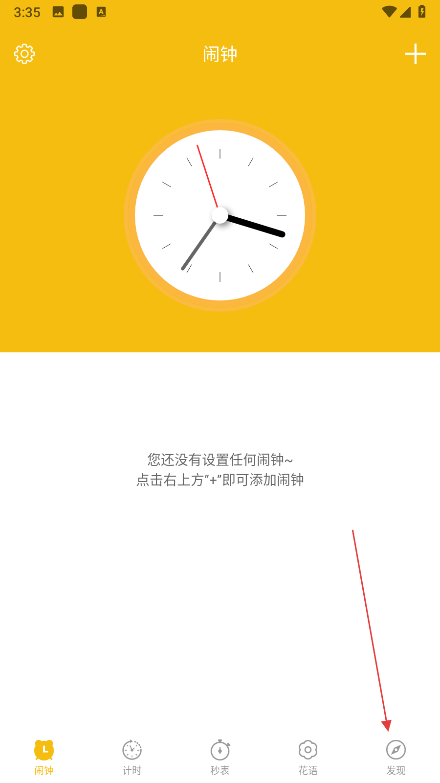 1、打开起床闹钟提醒大师应用,进入闹钟主界面后,点击页面右下角的发现选项。