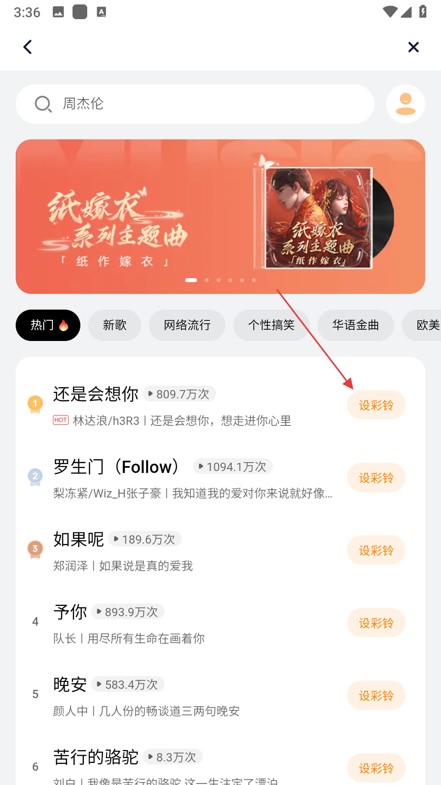 3、进入铃声选择界面后,在热门歌曲列表里,找到想要设置为彩铃的歌曲,点击歌曲右侧的设彩铃按钮。