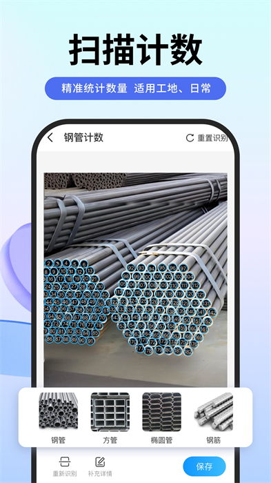 选择计数类型,拍摄或相册导入进行扫描计数,系统智能识别图片中的数量,支持计算钢管、钢筋、盘扣斜杆、轮扣、方管、圆木、方木等。