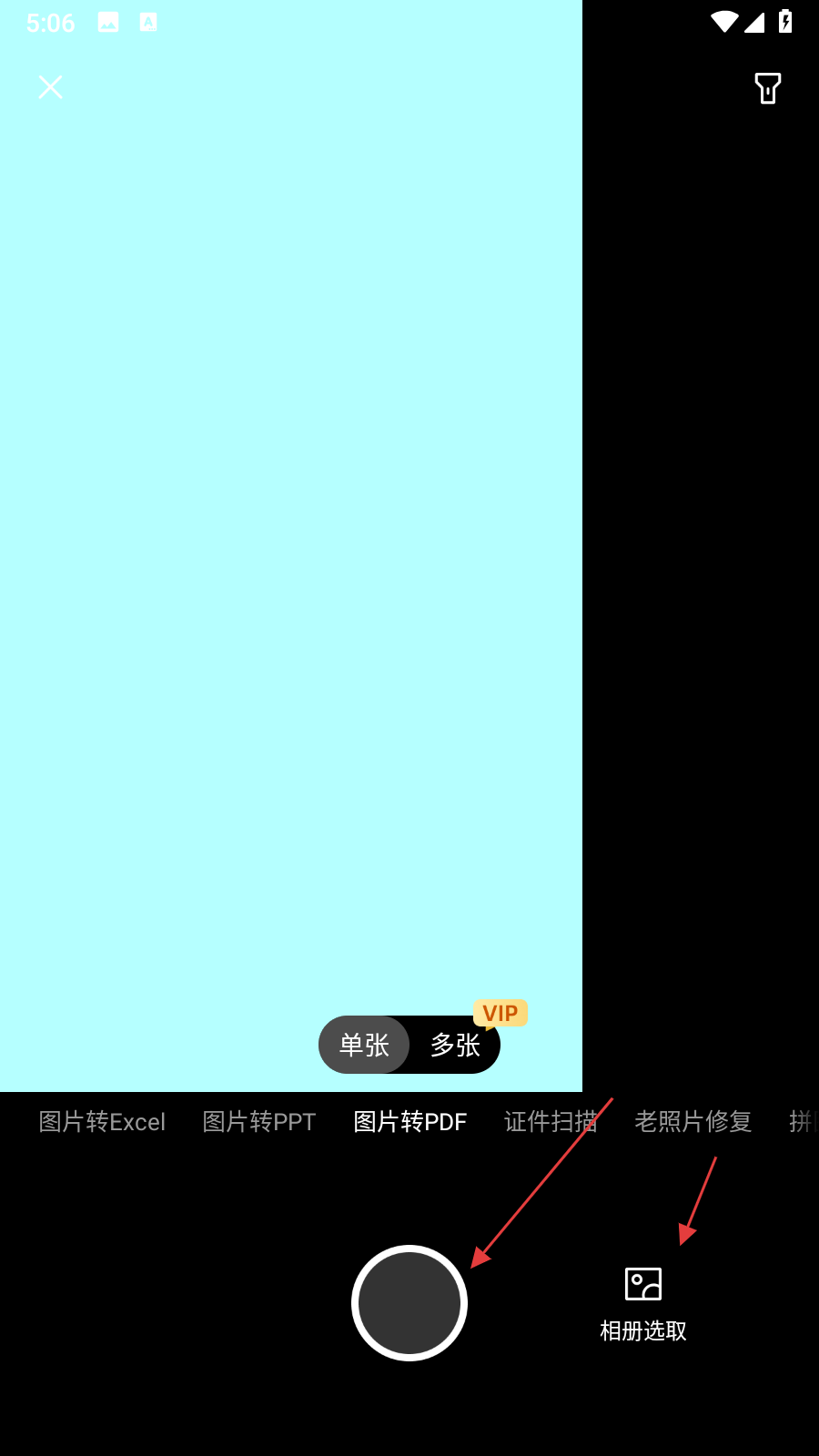 2、在该界面,点击相册选取从手机相册选需转换的图片,或点击拍摄按钮直接拍摄获取素材。