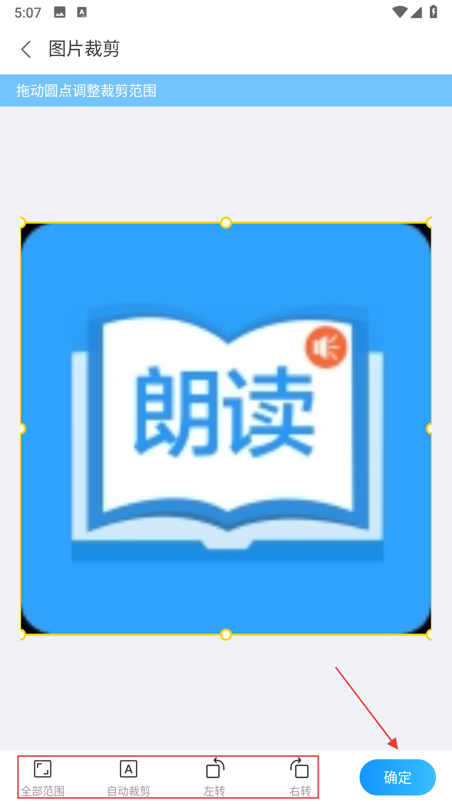 3、选好图片后进入裁剪页,拖动圆点调整裁剪范围,也可借助功能调整图片,完成后点击确定。