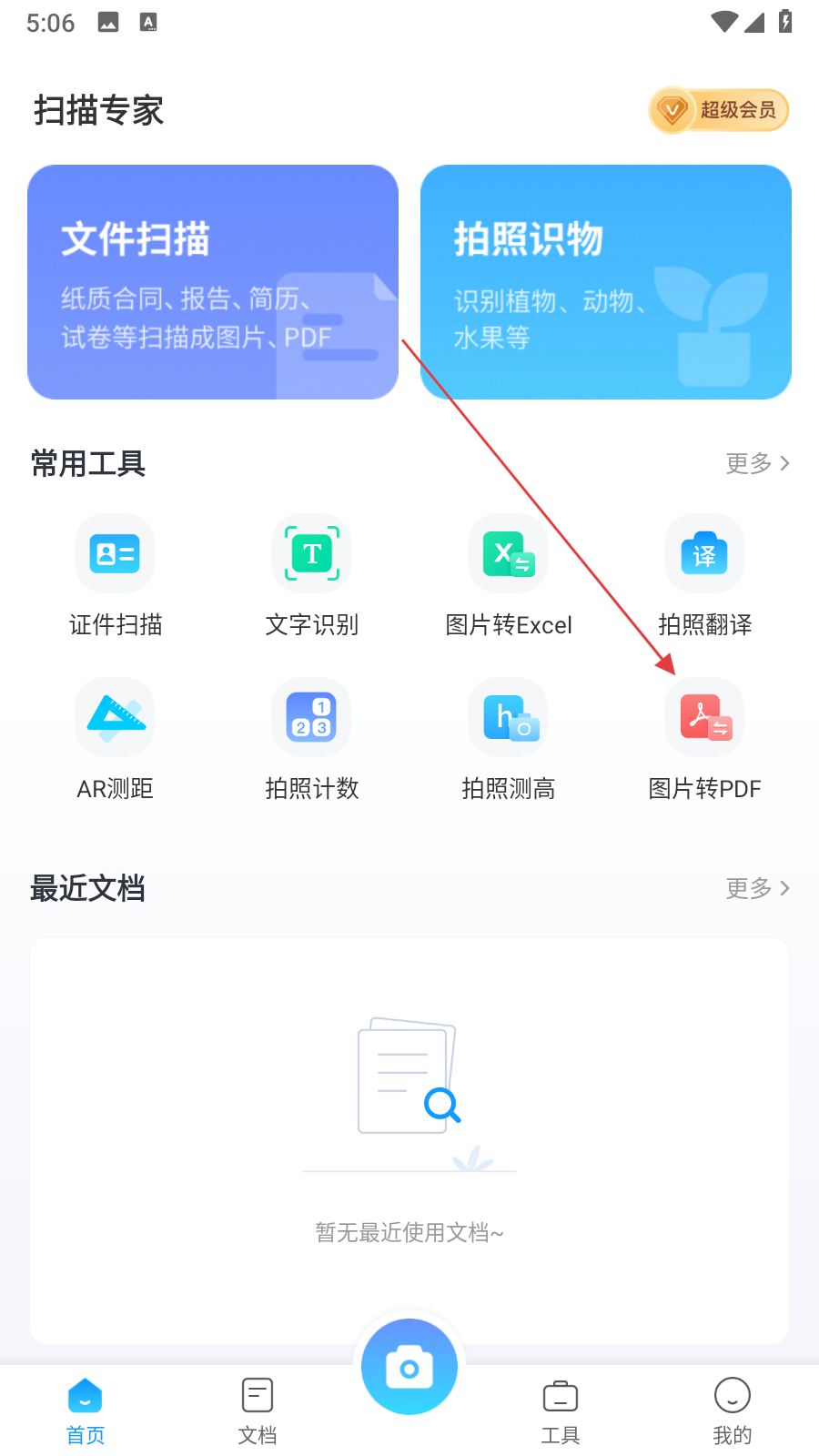 1、打开扫描专家应用,在首页常用工具区点击图片转PDF。