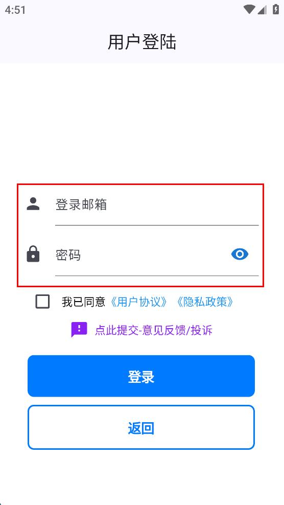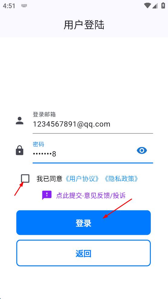 4、输入完邮箱和密码后,勾选我已同意用户协议,隐私政策选项,然后点击“登录”按钮,完成登录操作。