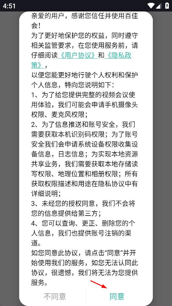 1、打开百佳会应用,会出现包含用户协议和隐私政策说明的页面,仔细阅读相关内容后,点击“同意”按钮,进入后续操作界面。