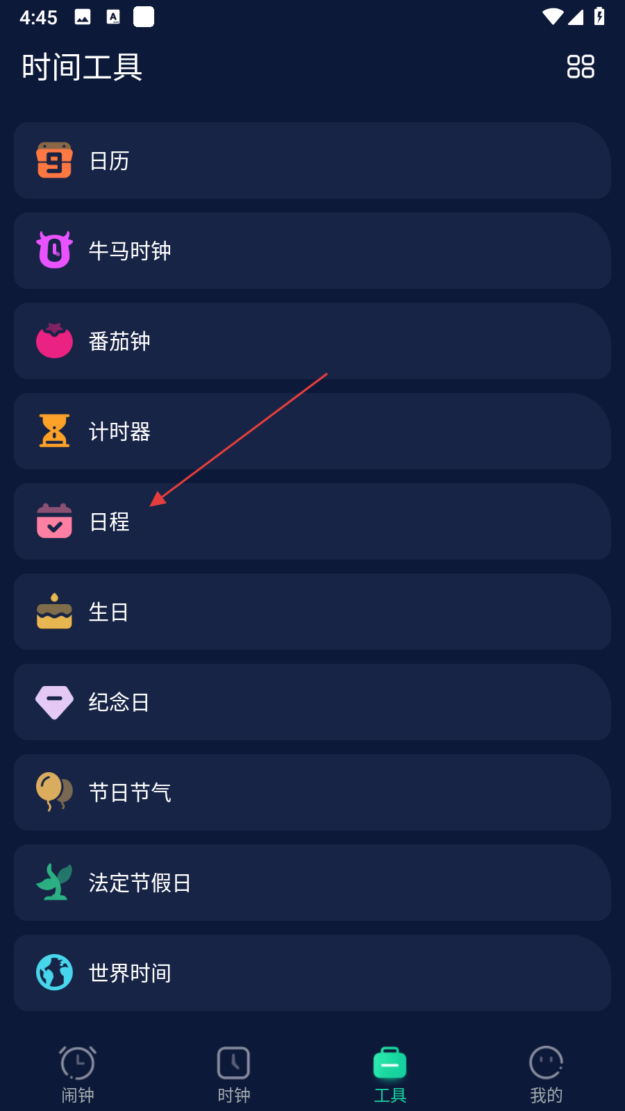 2、在时间工具页面中,找到日程选项并点击,进入日程列表页面。