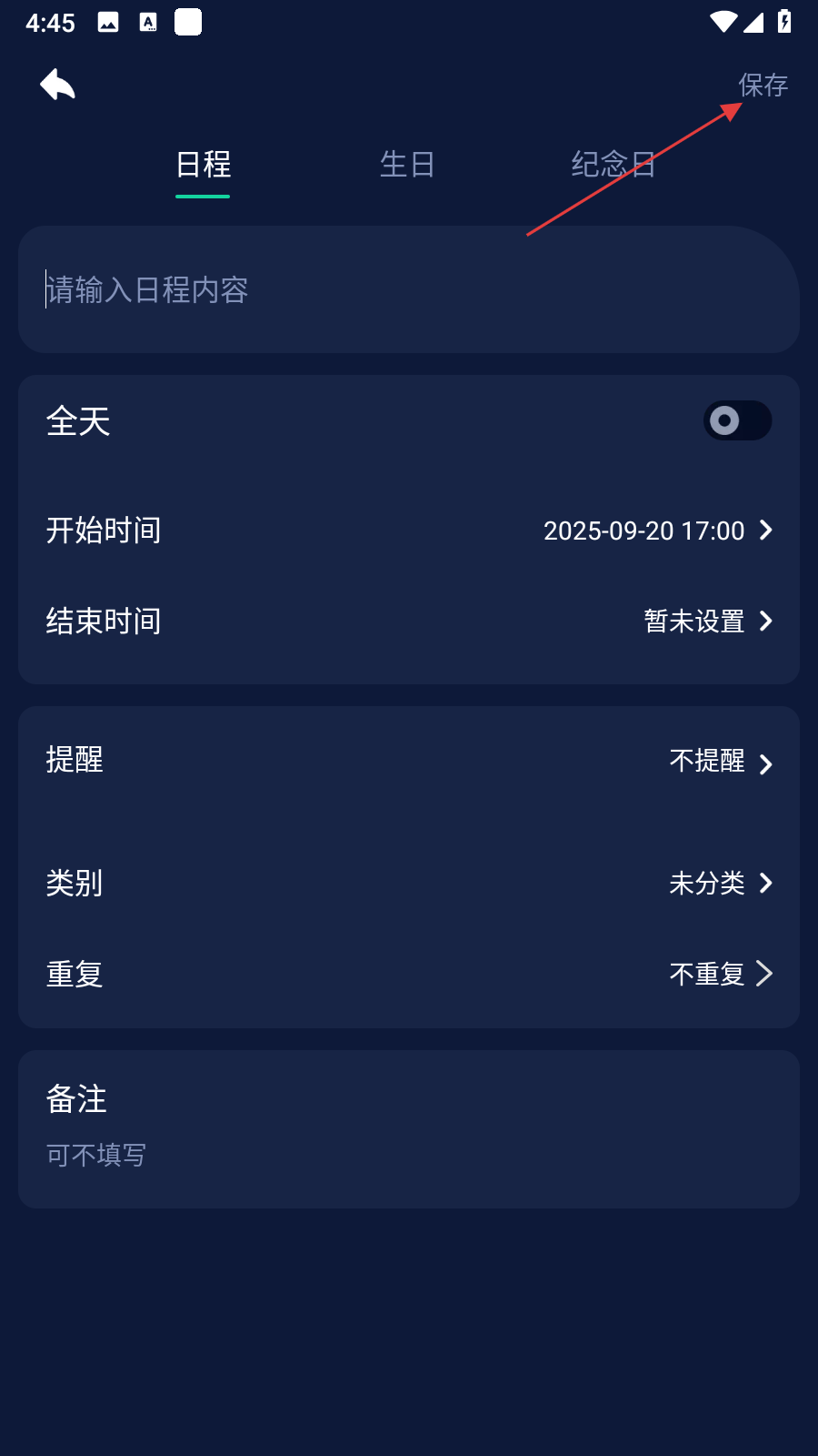 4、在日程设置页面,输入日程内容,设置开始时间、结束时间、提醒方式、类别、重复周期等参数,设置完成后点击右上角保存。