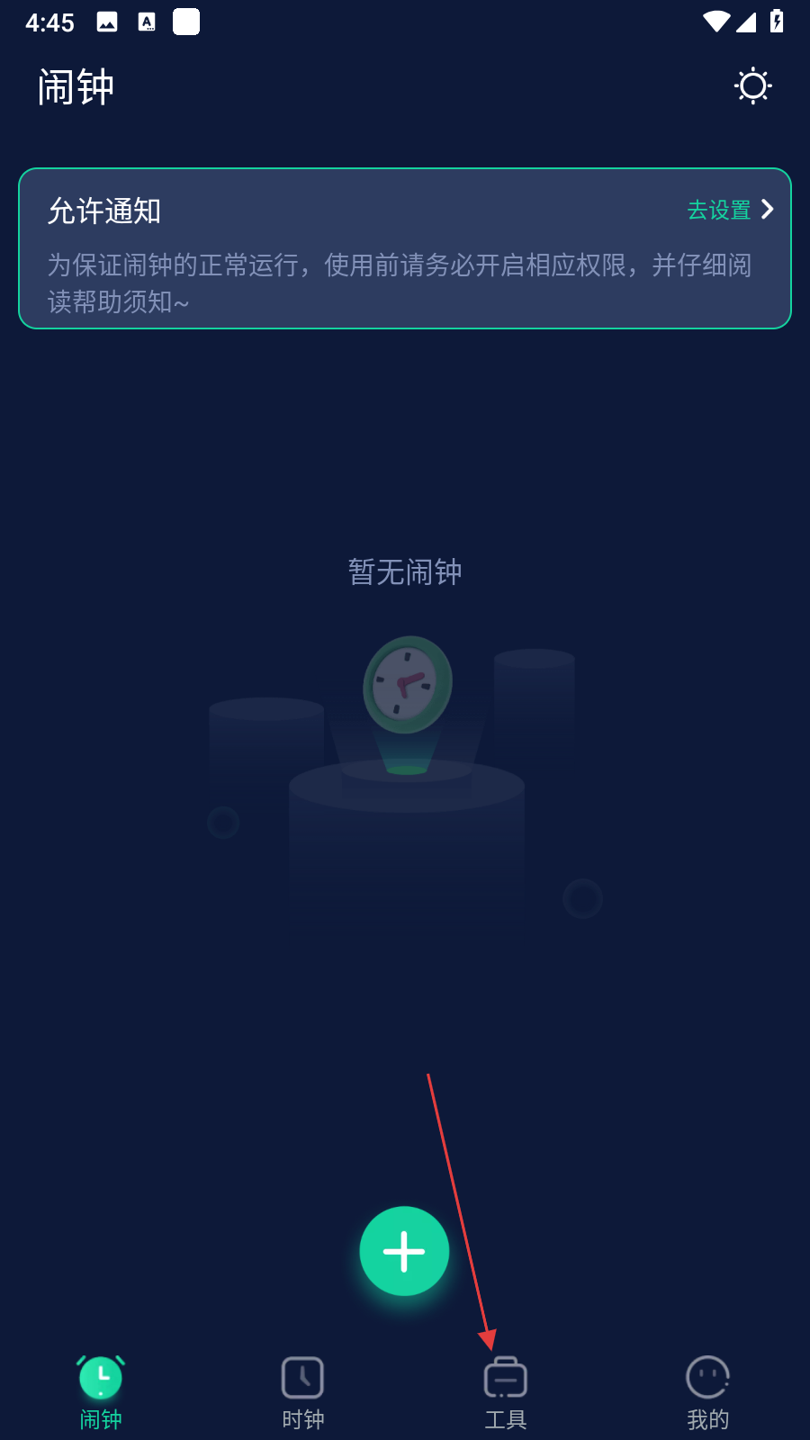 1、打开手机闹钟应用,点击底部工具选项,进入时间工具页面。