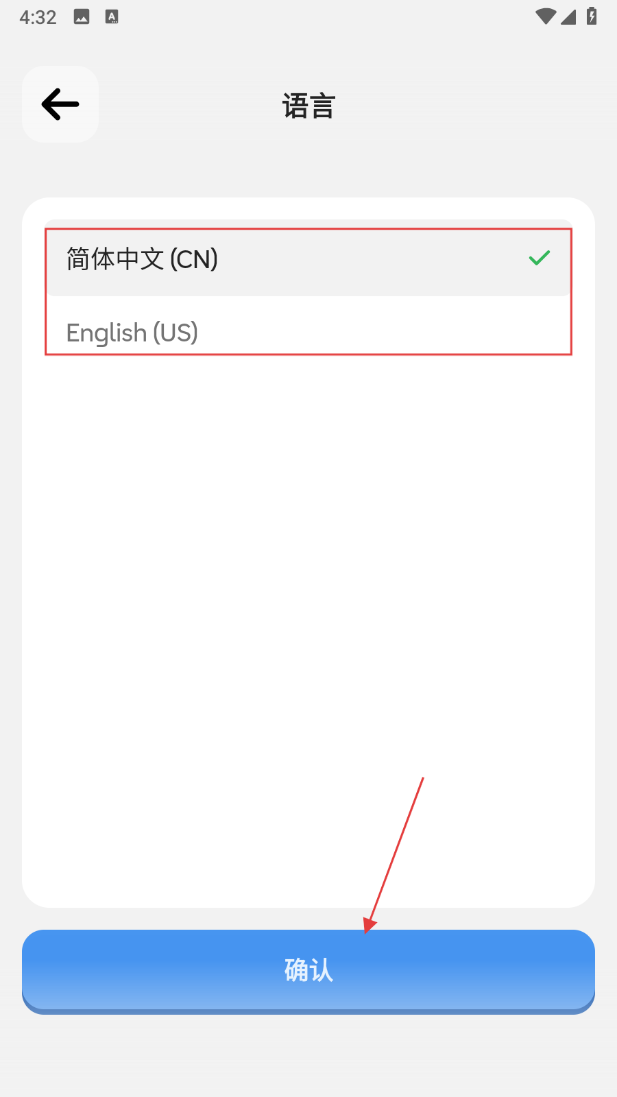 4、在语言选择窗口中,根据需求选择中文或English,选择完毕后点击确认按钮。