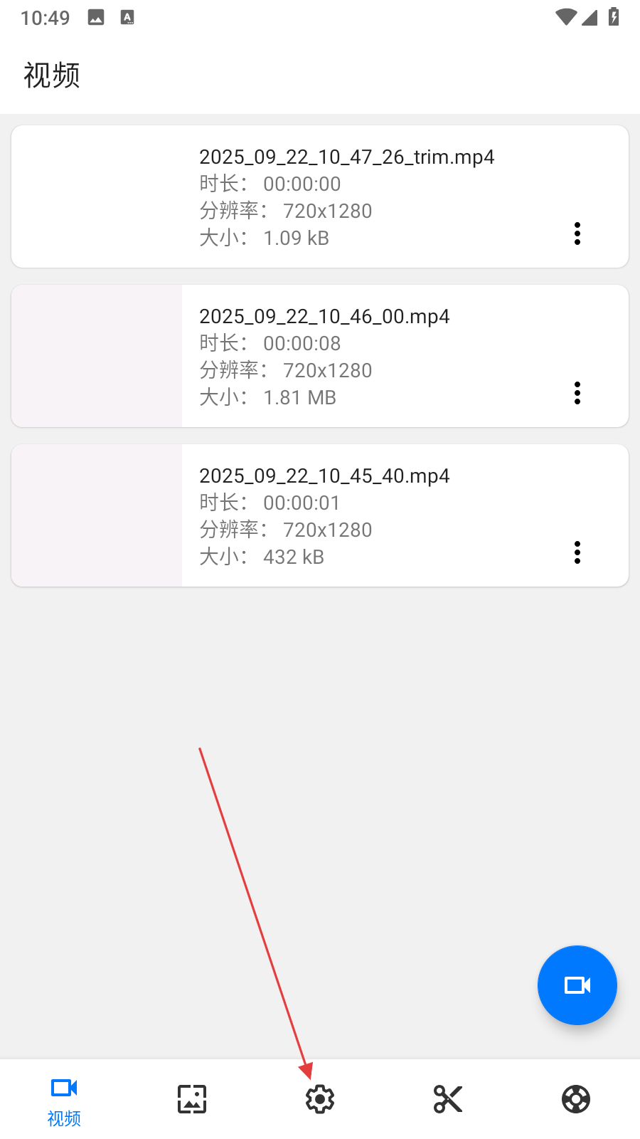 1、打开 Screen Recorder 应用,在视频页面点击底部的齿轮形状设置图标,进入设置界面。