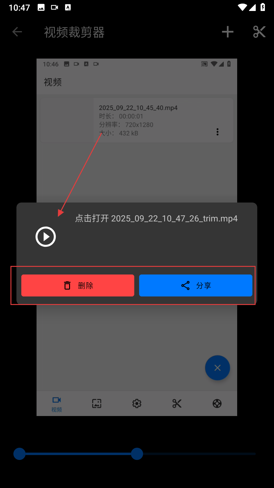 4、裁剪完成后,点击右上角会弹出提示框,可选择打开裁剪后的视频,也能进行删除或分享操作。
