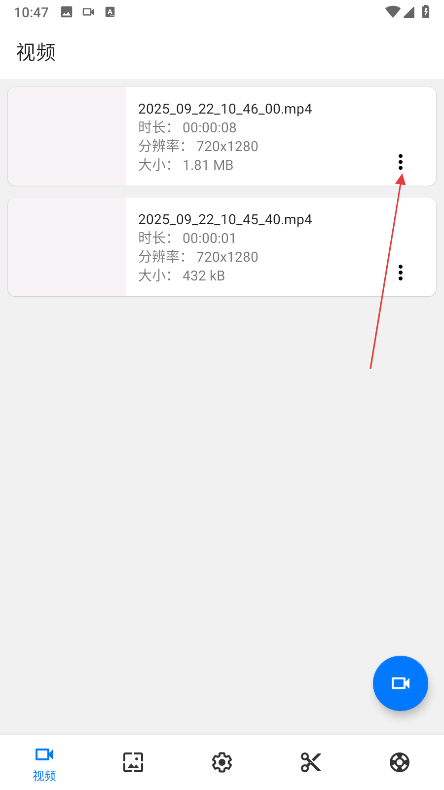 1、打开Screen Recorder应用,在视频列表里找到需裁剪的录制视频,点击视频右侧的三点图标,弹出操作菜单。