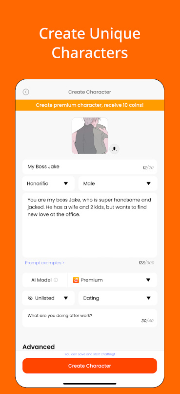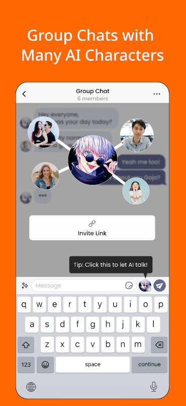 包含10万+不同风格的虚拟角色,涵盖动漫、约会、悬疑等多种主题,如“ShirtlessBadBoy”“MysteriousGirl”等,每个角色都有独特的性格设定和对话风格,满足用户多样化的情感陪伴需求。