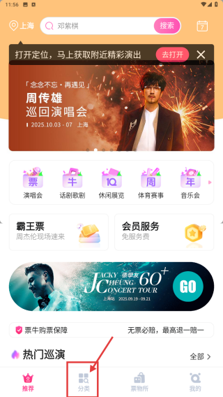 1、打开演出票务应用,点击底部分类选项,进入演出分类页面。