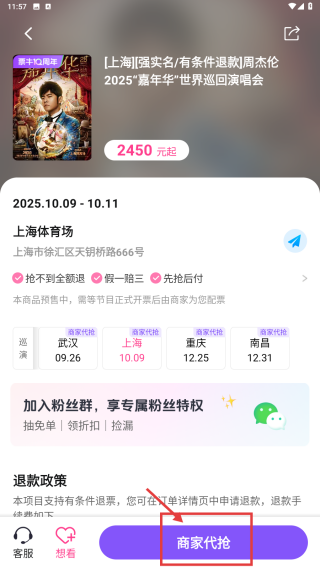 3、在演唱会详情页,点击商家代抢按钮,进入选票档界面。