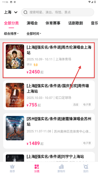 2、在演出分类页面,找到上海强实名有条件退周杰伦演唱会上海站条目,点击进入详情页。