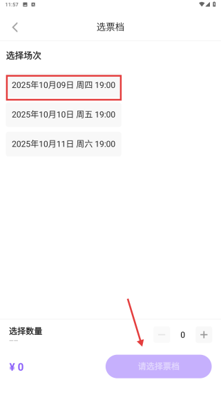 4、在选票档界面,选择2025年10月09日 周四 19:00场次,点击请选择票档按钮,继续后续购票操作。