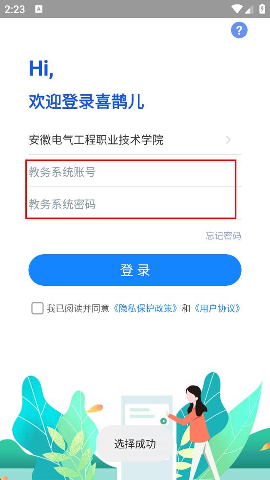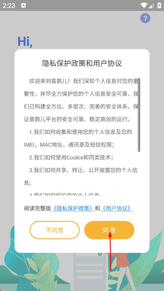 1、打开喜鹊儿APP,在“隐私保护政策和用户协议”弹窗中,点击“同意”,进入选择学校页面。