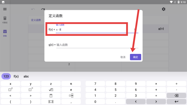 2、在定义函数窗口的f(x)栏输入f(x)=x*8,点击确定按钮,完成函数公式的自定义设置。
