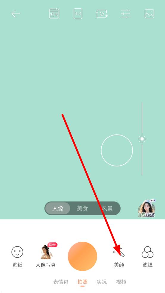 2、在拍摄界面,点击下方美颜按钮,进入美颜设置页面,可对肤质、脸型等进行调整。