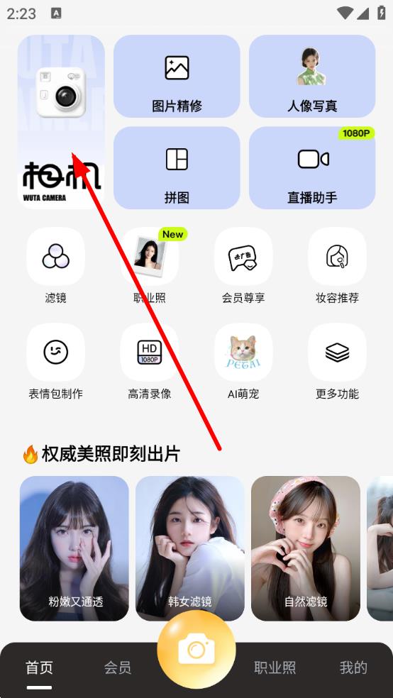 1、打开无他相机,点击首页左上角相机图标,进入拍摄界面开启拍照准备。