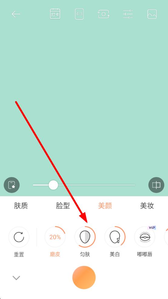 3、在美颜设置里,找到匀肤功能并点击,通过调整让肤色更均匀,搭配磨皮、美白等其他美颜选项,优化拍照效果。